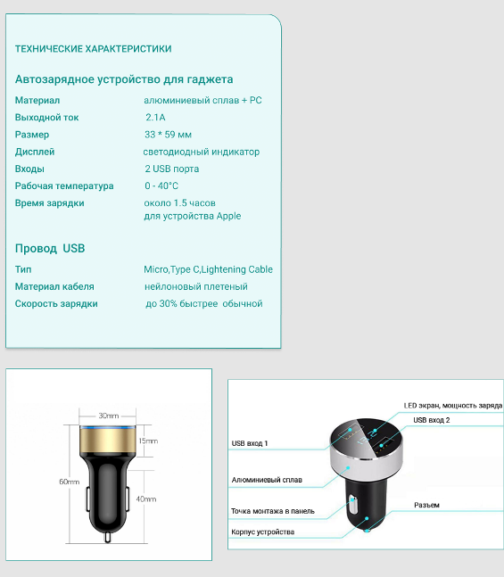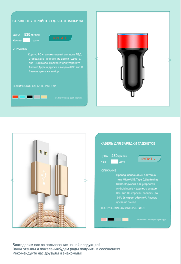 Сторінка продає компактні та швидкі дорожні зарядки електронних пристроїв через акумулятор автомобіля, та сумісні з нею проводи USB.