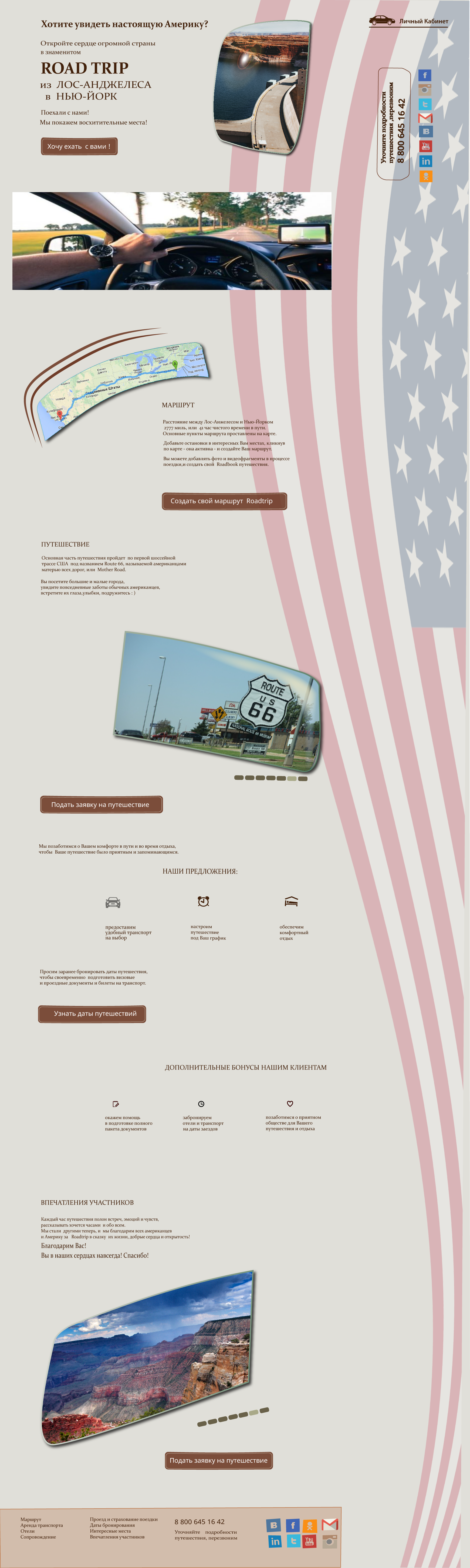 Сторінка унікальної пропозиції авто подорожі по США Представлено особливості подорожі та сервіси від організатора, зручності